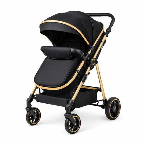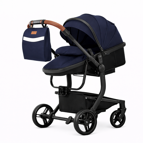 Poussette 3-en-1 avec finition noire et détails en cuir marron. Adaptée dès la naissance, elle peut se transformer en landau, siège auto ou poussette selon vos besoins. Son design avec grandes roues et suspension assure une conduite confortable. Le harnais ajustable et le canopy extensible offrent sécurité et confort pour votre enfant.